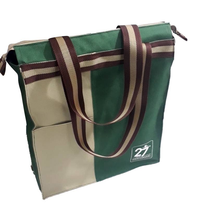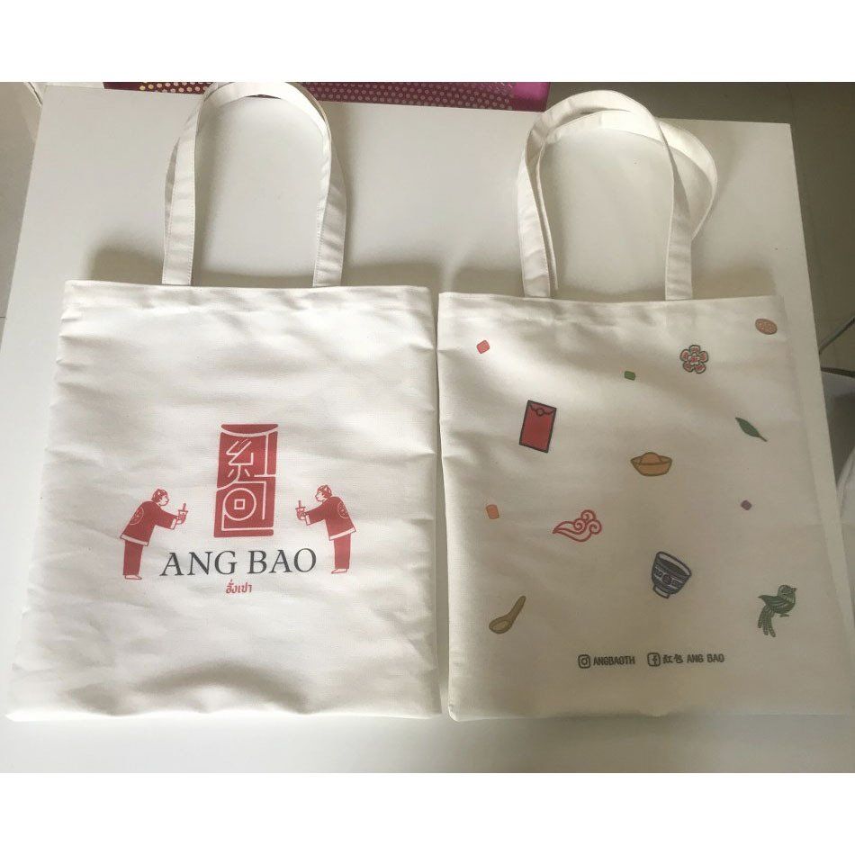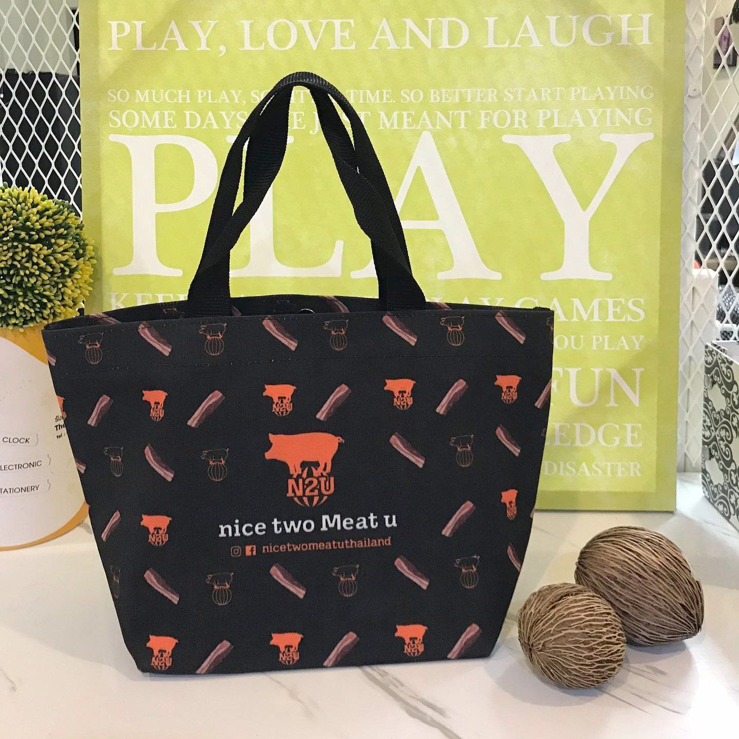 สกรีนโลโก้ 1 สี 2 จุด และ พิมพ์โลโก้ Heat Tranfer 1 จุด ที่สายหูหิ้ว